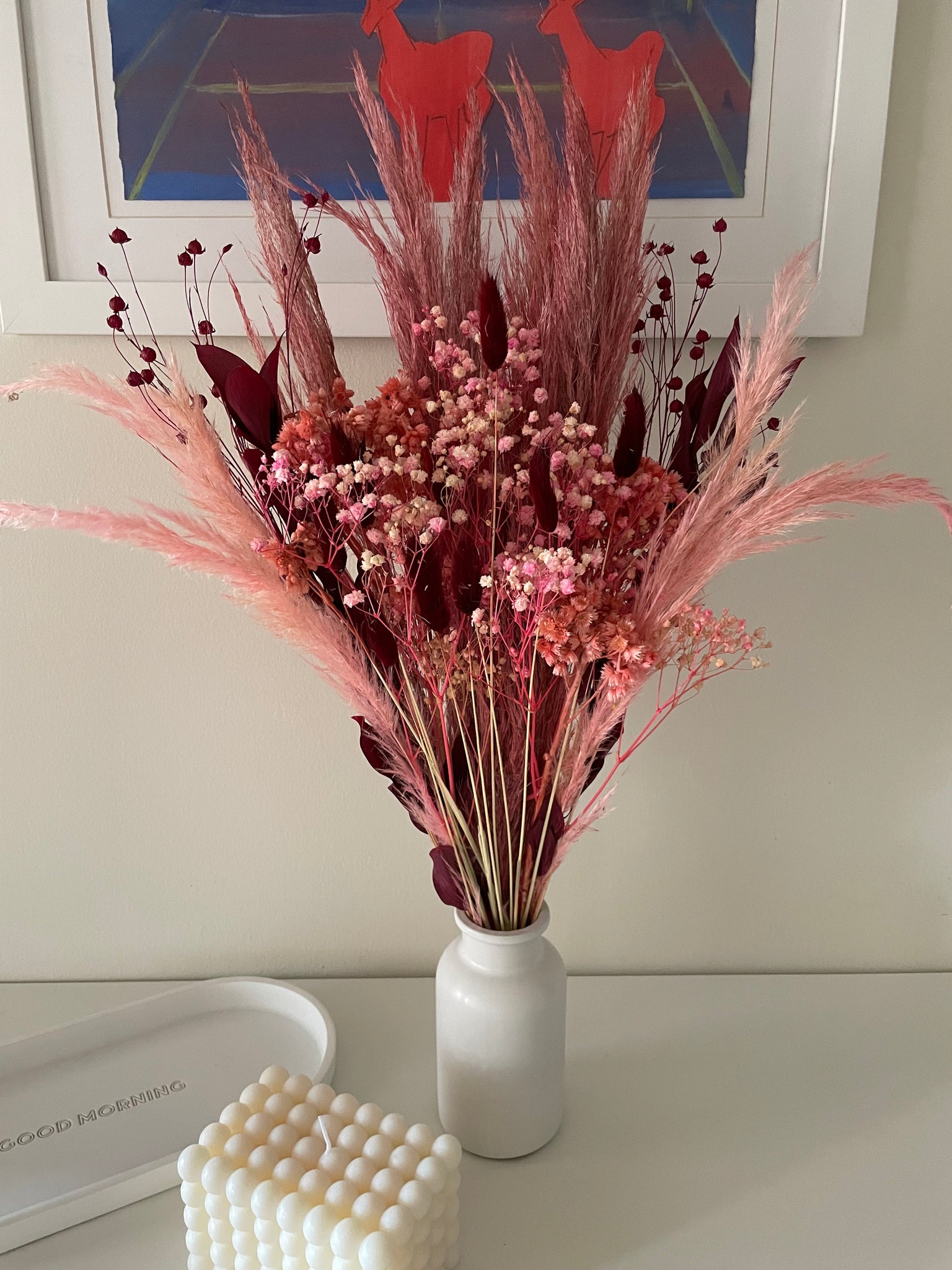 (2) Andean Light Pink Preserved  (10) Bunny Burgundy, (3) Gypso Light Pink, (4) Linum Burgundy (6) Pampass Slim Pink (4) Plume grass light pink, (2) Ruscus Burgundy