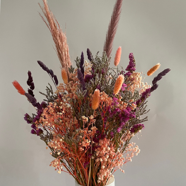 (4) Limonium Natural Green, (4) Statice Fuccia, (4) Gypto Light Pink, (8) Orchard Grass Purple, (1) Penisetum Grape, (6) Alpiste Pink, (1) Pampas Slim Red Stem
