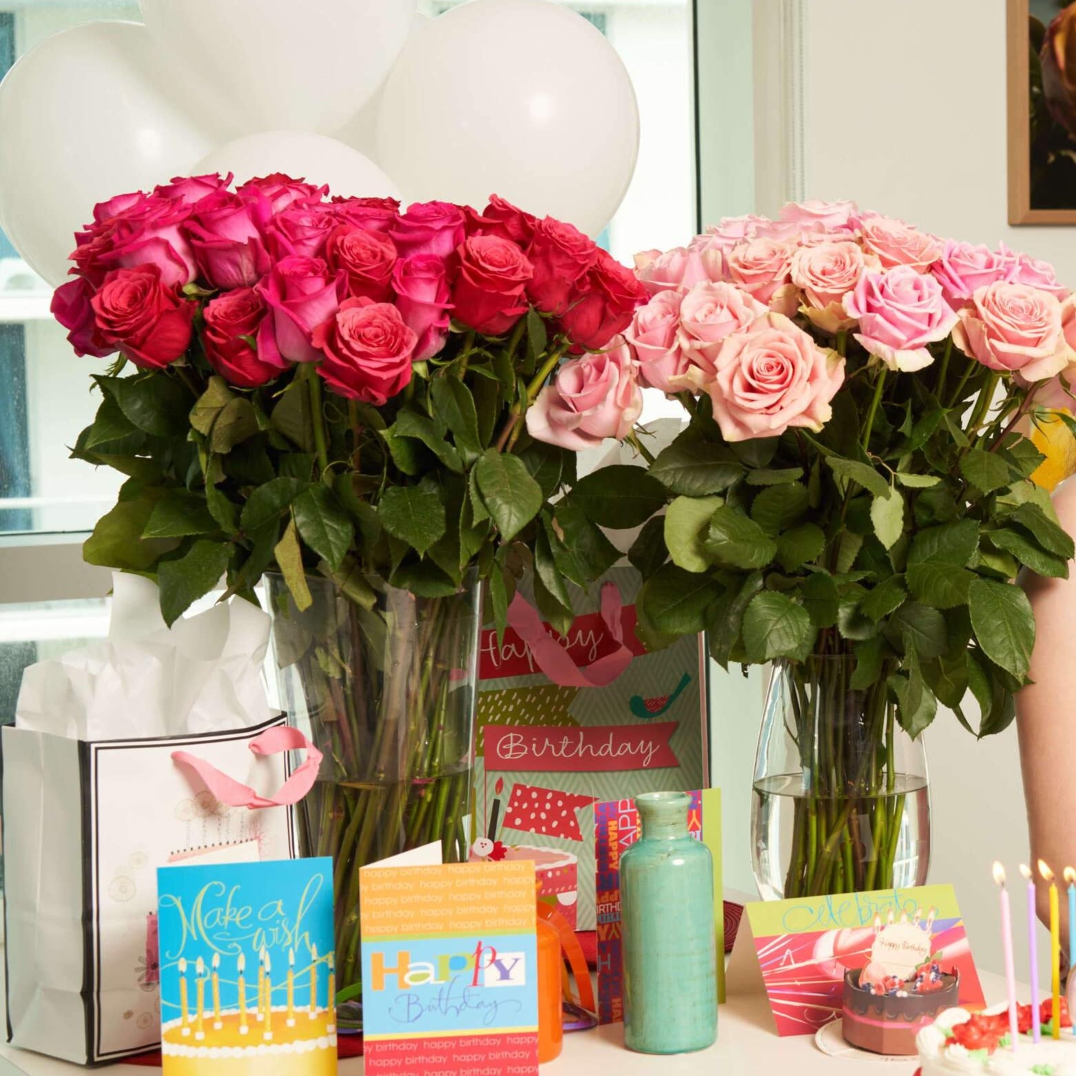 hot pink & bicolor pink roses in a glass vase on a table with celebration material